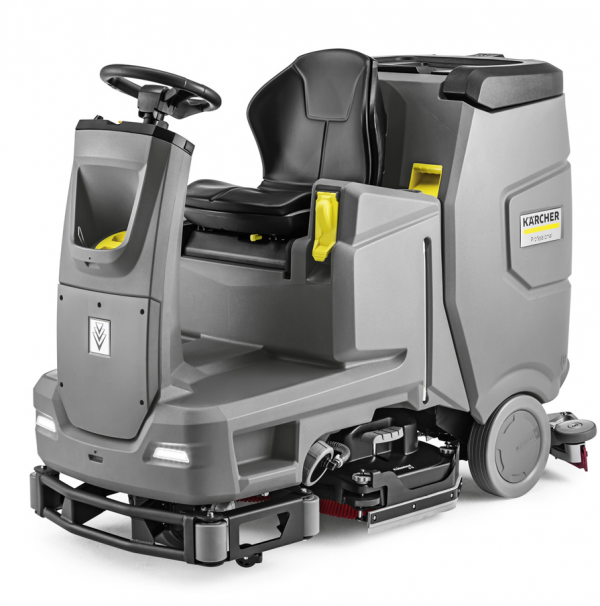 B 110 R binicili tip zemin otomatı; 75 santimetre çalışma genişliğine sahip disk fırça başlığı, entegre akü şarj cihazı ve 110 litre tank kapasitesi ile.