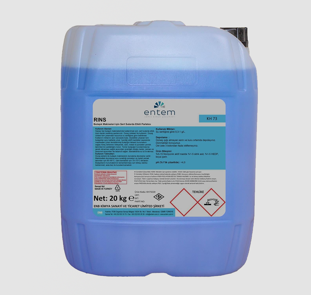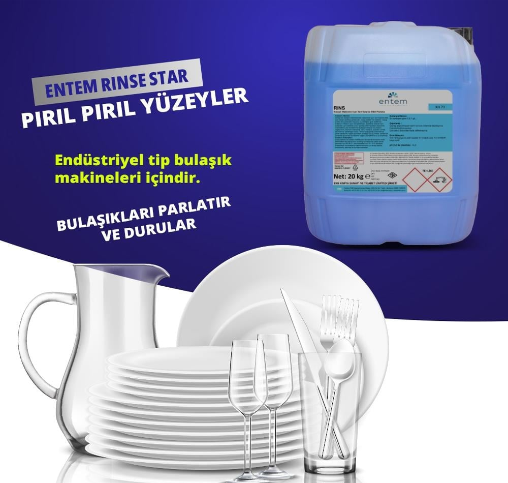 Entem Rinse Endüstriyel bulaşık makinaları için durulama ürünü, parlatıcı. Bulaşık makinelerinde deterjan kalıntısını yok eder ve durulama sağlar. Porselen, cam, paslanmaz çelik gibi materyallerde parlaklık oluşturur. Yıkanan bulaşığın durulama etkinliği artırır. Sanayi tipi bulaşık makinelerinde kullanılmak için, sert sularda etkili, Su sertliğine göre 0,3-1 g/L. Özel olarak üretilmiş parlatıcıdır. Dozaj üniteleri ile kullanılır. Dozaj Ünitesi tüm yıkamalar boyunca su sertliğine göre belirlenen Kullanım miktarını aynı seviyede tutar, böylelikle yıkanan tüm bulaşıklar aynı kalitede çıkar. İçerdiği aktif maddeler sayesinde makineden çıkan temizlenmiş bulaşığın lekesiz kurumasını sağlar. Kireç birikimini önleyerek, cam, metal ve porselen yemek takımlarının parlaklığını korur. Temiz bulaşığın kurulanmasına gerek olmaması sağlık açısından avantajlı olduğu kadar, zaman ve personel açısından da tasarruf sağlar. Bardaklarda su izi bırakmaz.